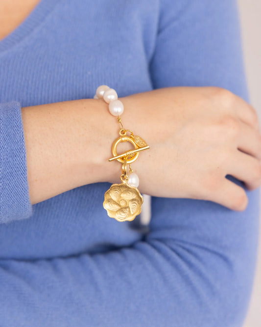 Gold Oyster Plate Genuine Fresh Water Pearl Toggle Bracelet