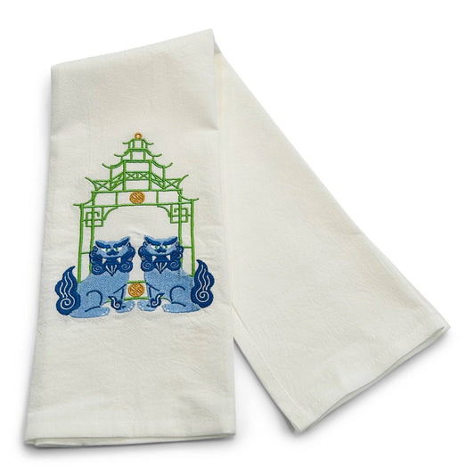 Towel - Blue Shisa Lions with Green Pagoda on white
