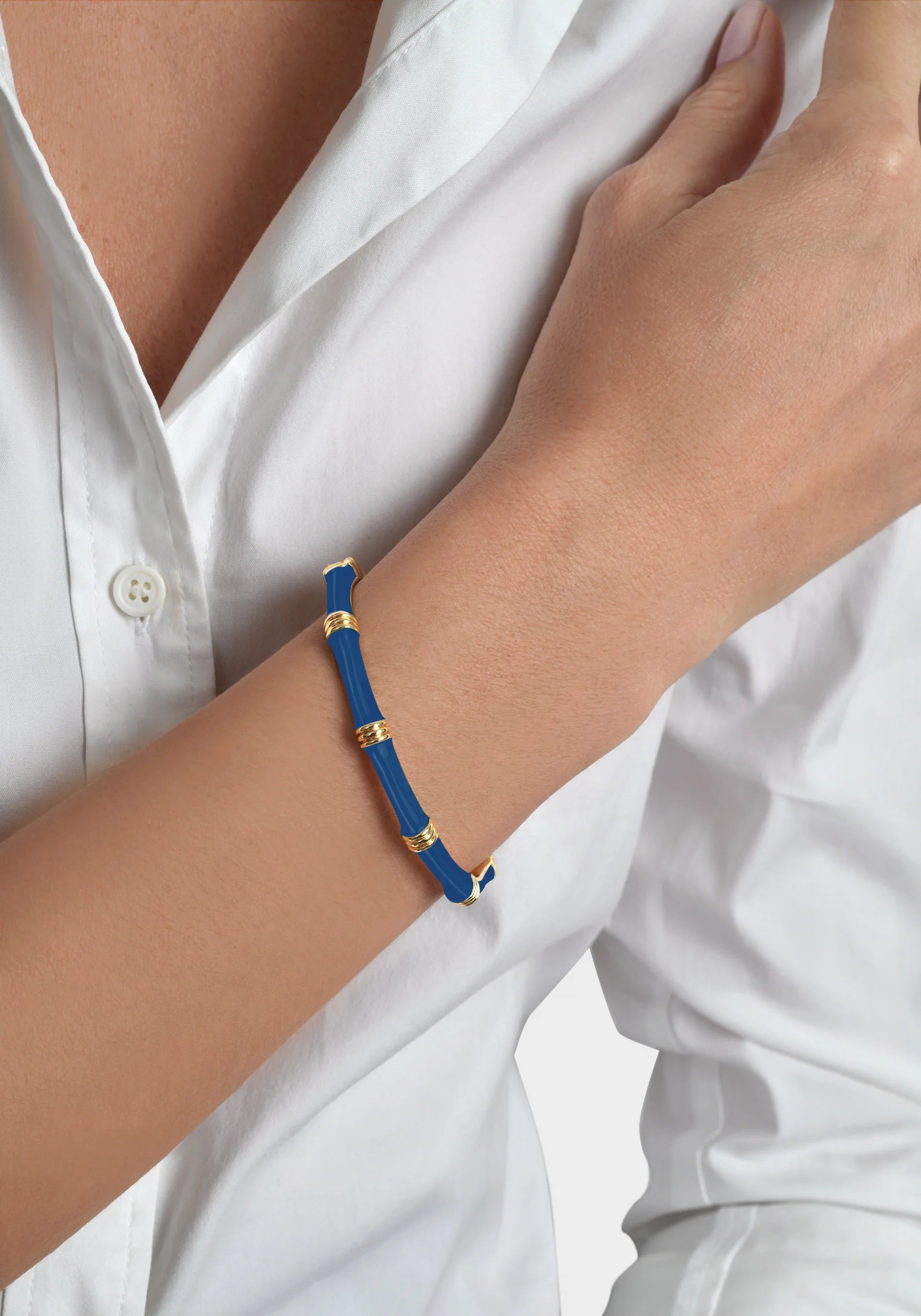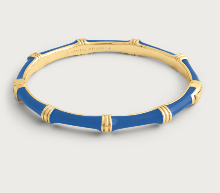 Elevate your everyday looks with the radiant allure of this bamboo hinged bangle in hand painted enamel colors. Crafted from sumptuous 18k gold-dipped brass, the bangle is sculpted to perfection, adorned with sparkling crystals that catch the light with every movement. Its secure hidden clasp, reminiscent of the finest jewelry craftsmanship, ensures both elegance and ease of wear, making it a refined accessory for any occasion. In the realm of accessories, this bamboo hinged bangle stands out as an exceptional piece of artistry. The intricacy of the sculpted design and the shimmering crystals culminate in a perfect union of glamour and versatility. The hidden clasp adds an element of mystery and refinement, making this bangle a stunning addition to your collection. Whether paired with casual or formal attire, it promises to be the perfect touch of sophistication, adding a radiant sparkle to your daily ensembles.