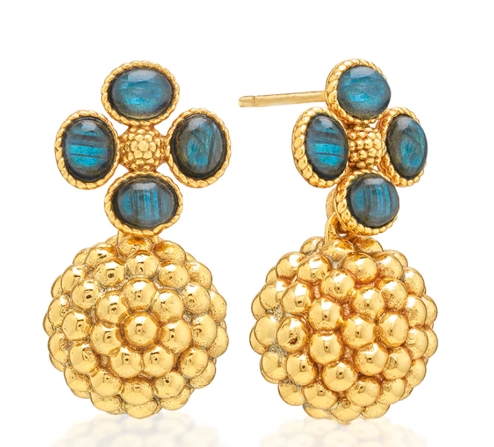 Gorgeous gold berries dangle from clovers made of luminous blue labradorite gemstones, centered with petite gold berries to make a subtle statement when paired with everything from a pair of jeans to a cocktail dress.