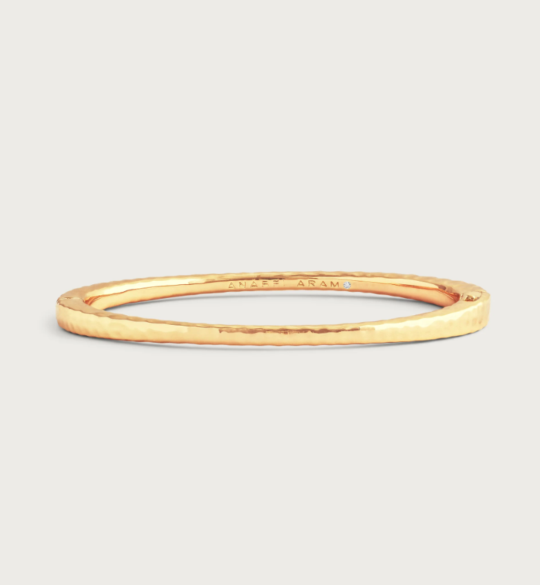 Effortlessly elevate your style with our Farrier Thin Hinged Bangle in 18k gold plated brass. The timeless and classic design is perfect for the modern, minimalist fashionista. The hammered detailing adds a touch of chic to any outfit. Embrace the effortless elegance of the Farrier thin hinged bangle.