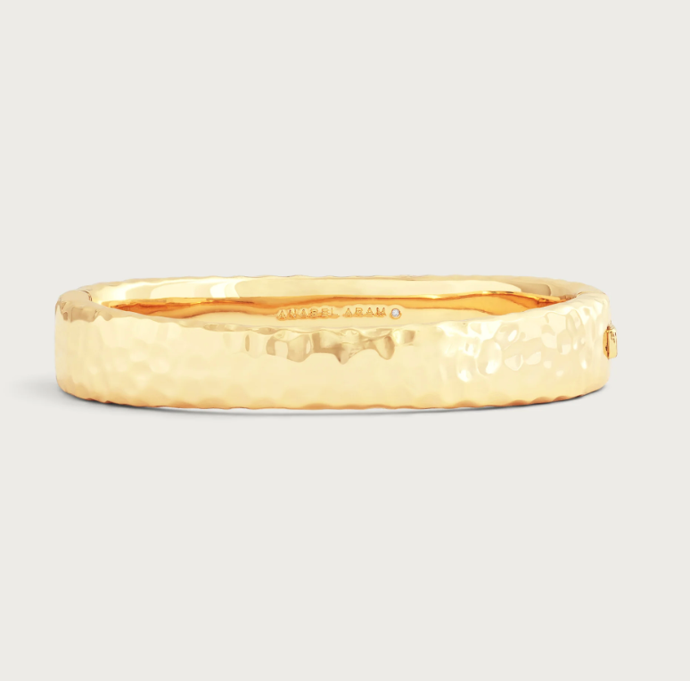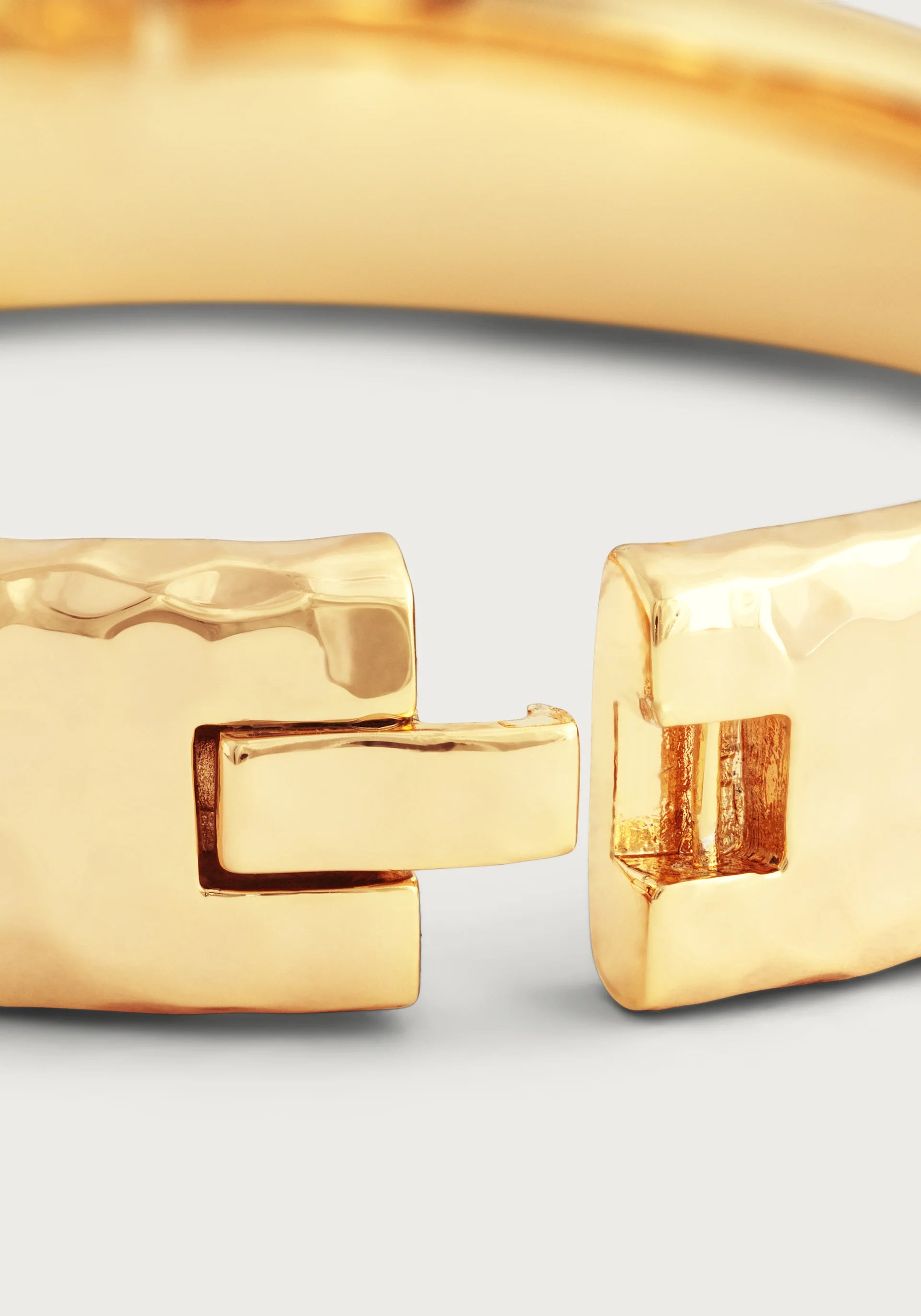 This modern and minimalist Farrier Wide Hinged Bangle in 18k gold dipped brass adds a timeless and classic touch to any outfit. Its hinged design makes it easy to wear and stack with other bracelets, while the hammered texture adds a statement element. Elevate your style effortlessly with this versatile piece.