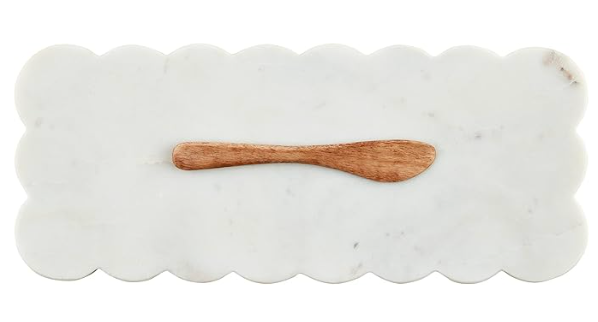The two piece set comes with a scalloped marble board. The scalloped board comes with a mango wood spreader. The tray is 5" x 12" and spreader 5 1/2, making a perfect housewarming gift.