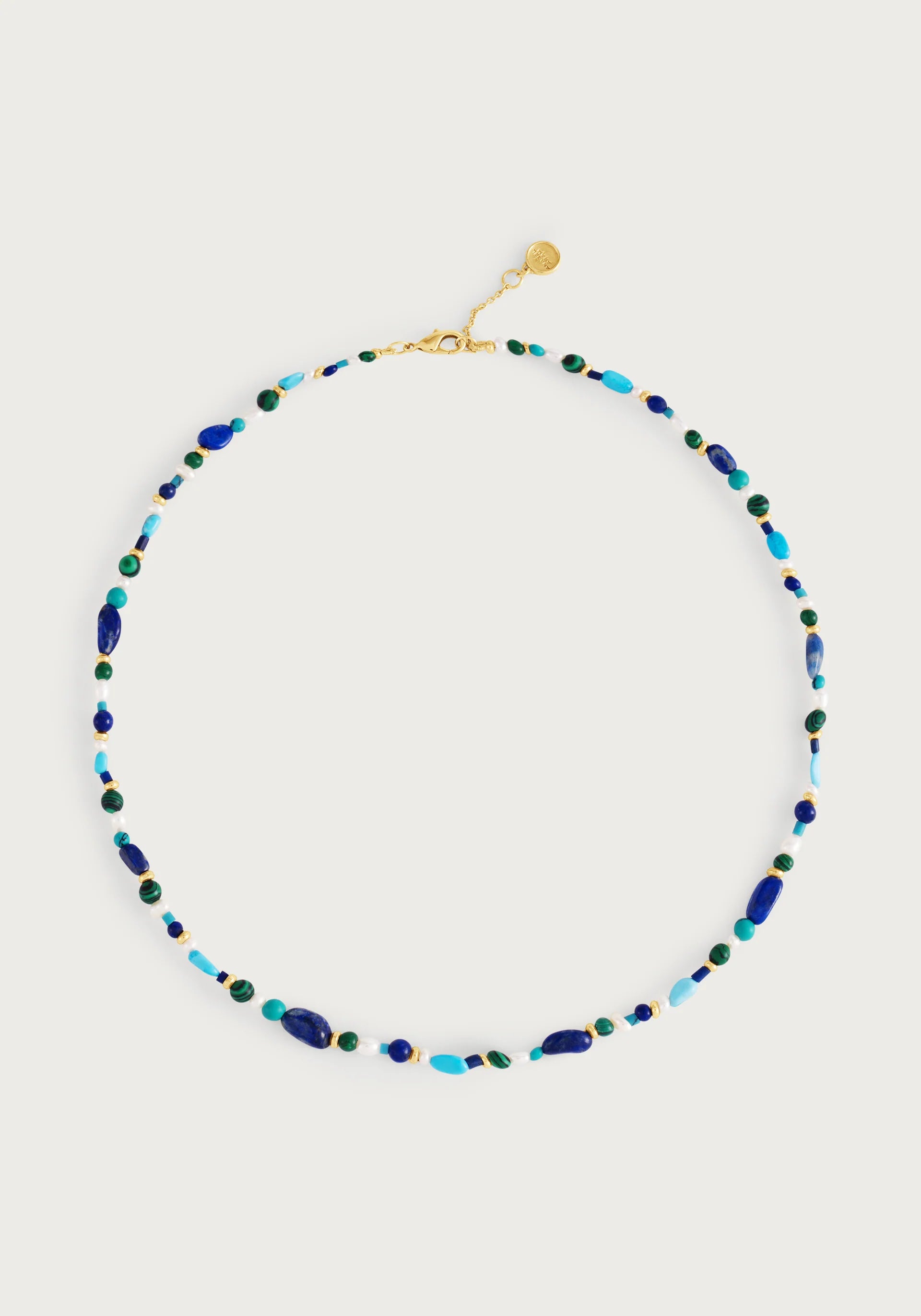 The Milos Cool Beaded Necklace captures the serene depths of Mediterranean waters, featuring carefully selected lapis lazuli, turquoise, malachite, and mother of pearl beads that reflect the tranquil blues and greens of hidden coastal coves. This versatile piece beautifully complements the collection's charm system, allowing you to layer meaningful pendants for a personalized touch, or wear it solo to showcase the natural beauty of these oceanic gemstones that evoke the calm of seaside mornings.